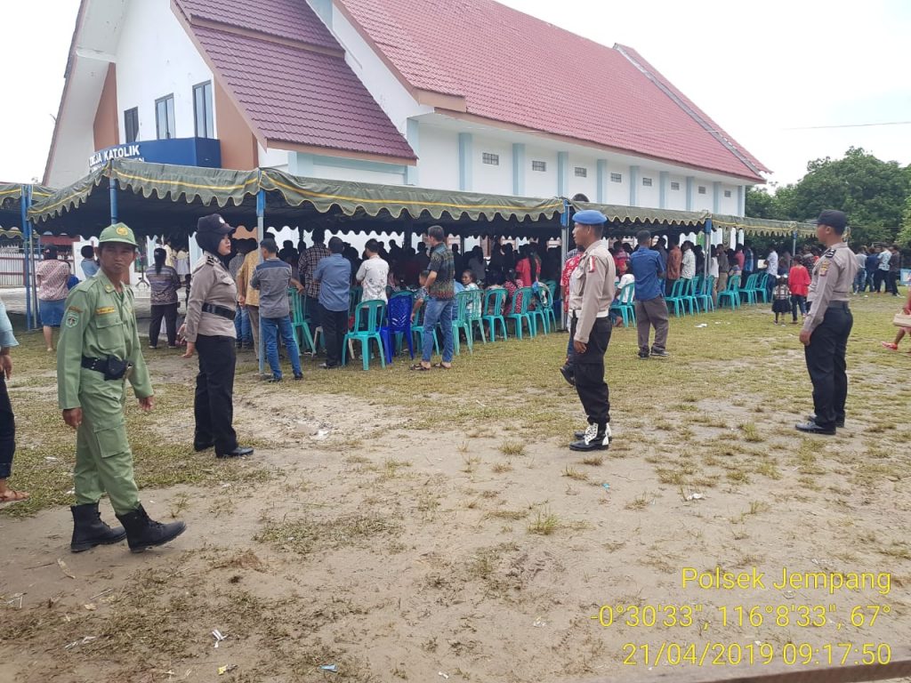 Anggota Kepolisian Sektor Jempang Polres Kubar melaksanakan pengamanan Perayaan Ekaristi dalam rangka Hari Raya Paskah di Gereja Katholik Paroki Santo Arnoldus Yanssen Kamp. Tanjung Isuy Kec.Jempang yang pimpim oleh Pastor Josep Jenau dan diikuti oleh sekitar 500 jemaat dengan Tema Bergerak Dan Berjuanglah, Bijak Berteknologi Menuju Kalimantan Baru, Minggu tanggal 21 April 2019 Pukul 08.30 sd 12.00 wib