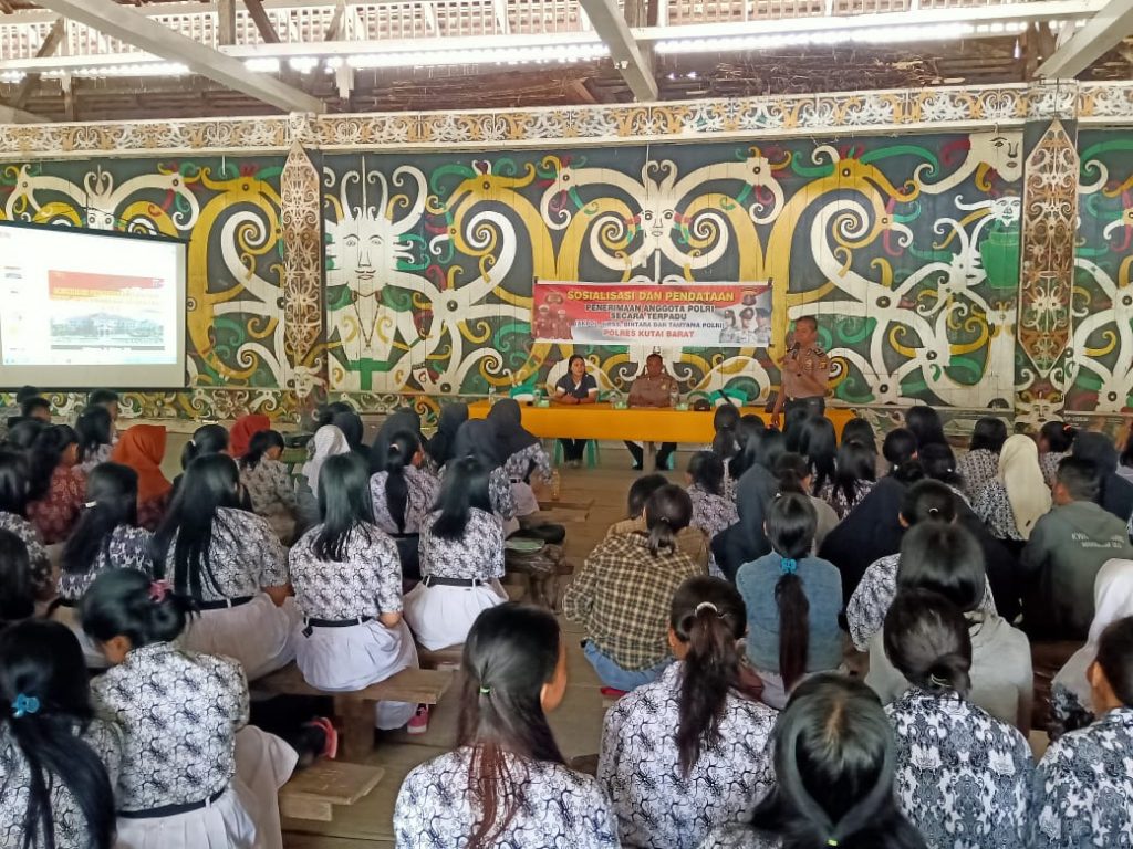 Long Hubung – Polres Kutai Barat menggelar sosialisasi kepada siswa siswi SMA 1 Long Hubung dan SMK Pelita Mahakam di Lamin Adat Kamp. Datah Bilang, Kec. Long Hubung, Kab. Mahakam Ulu tentang penerimaan calon anggota Polri tahun 2020 dan CPNS Polri TA 2019, Jum’at (14/11/2019).