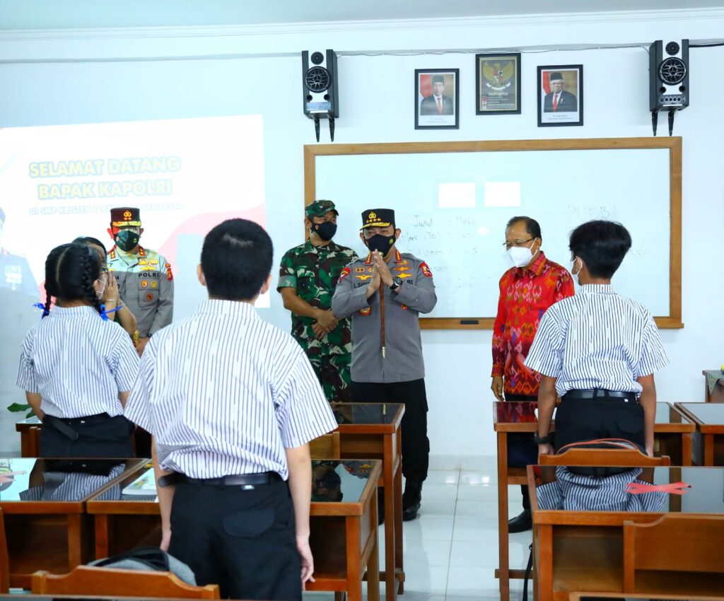 Bali – Kapolri Jenderal Listyo Sigit Prabowo melihat penerapan penegakan protokol kesehatan (prokes) proses Pembelajaran Tatap Muka (PTM) di SMP Kristen 1 Harapan, Kota Denpasar, Bali. Hal itu dilakukan untuk memastikan, para siswa dan pengajar terlindungi dari paparan Covid-19 serta tidak terjadi transmisi saat kembali ke keluarga.