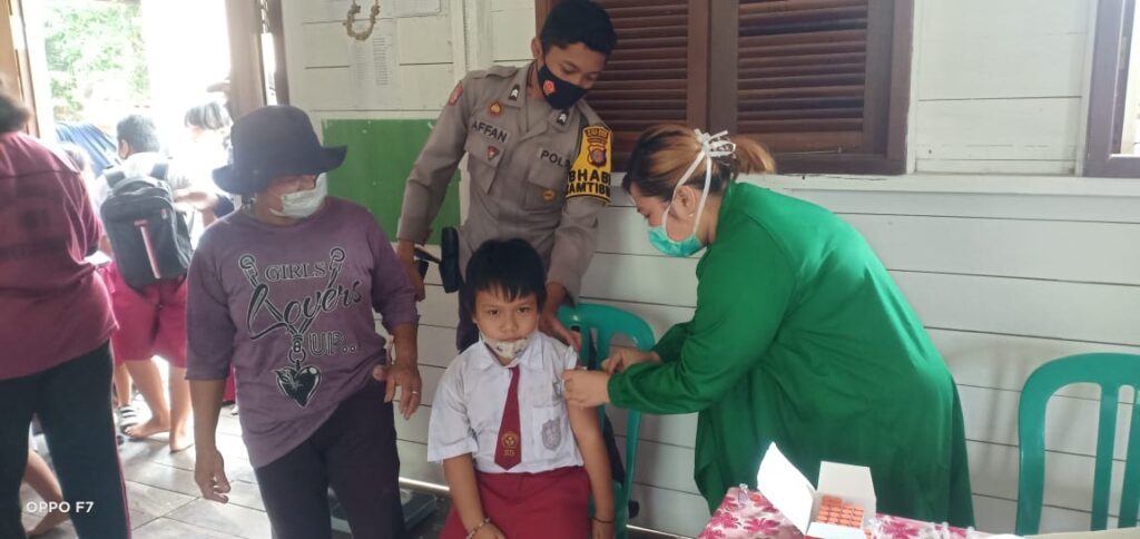 Bhabinkamtibmas Pantau Pelaksanaan Vaksinasi Covid-19 Tahap II Untuk Anak Usia 6-11 Tahun di Wilayah Perbatasan Kaltim-Kalteng