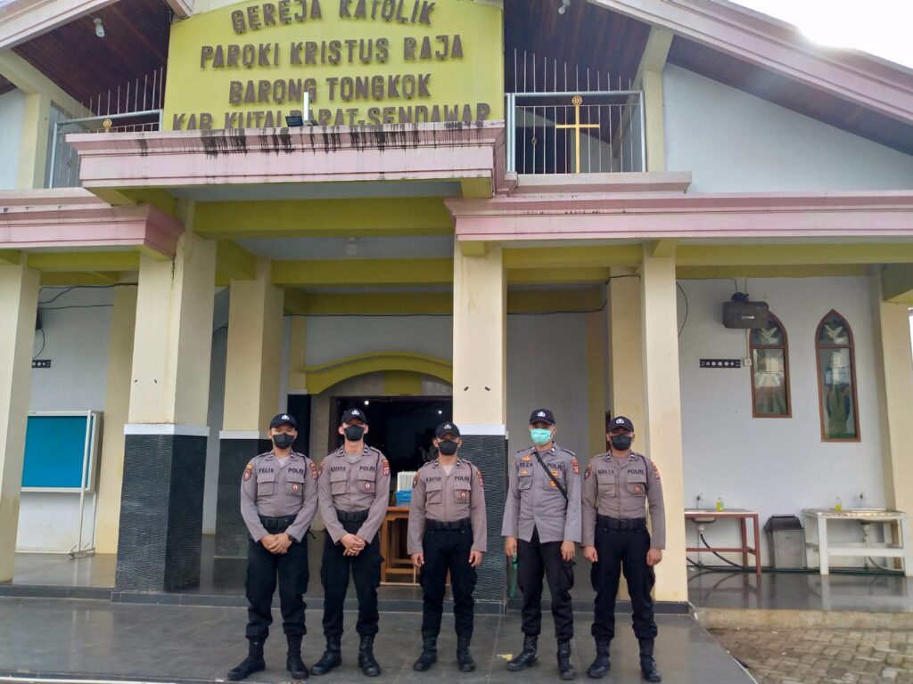 Polres Kutai Barat — Anggota Polres Kutai Kutai Barat melaksanakan kegiatan pengamanan gereja-gereja di wilayah Kabupaten Kutai Barat Minggu (21/8/2022) pagi.
