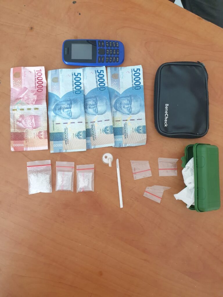 Ditangkap dengan barang bukti berupa Satu buah box kecil berwarna hijau yang berisi 2 lipatan tisu yang didalamnya terdapat 3 poket plastik bening yang berisi sabu ( 1 poket ukuran besar dan 2 poket ukuran sedang), 1 buah dompet berwarna hitam yang berisi 3 buah plastik bening dan 1 sedotan putih, 1 buah hp Nokia 105 warna biru, 1 buah botol kecil yang sudah di modifikasi, dan 3 lembar uang pecahan Rp.50.000,00 dan 1 lembar uang pecahan Rp.100.000,00