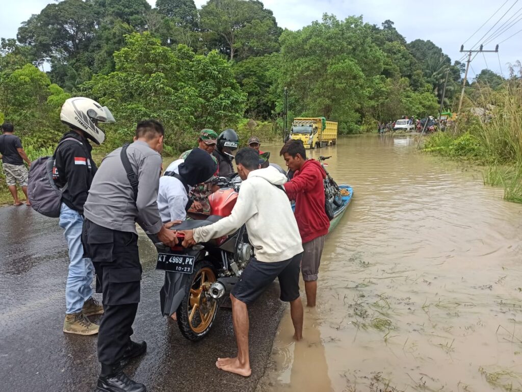 JALAN TRANS KALTIM TERENDAM BANJIR, PERSONEL POLSEK MUARA LAWA BANTU WARGA MELINTASI JALAN