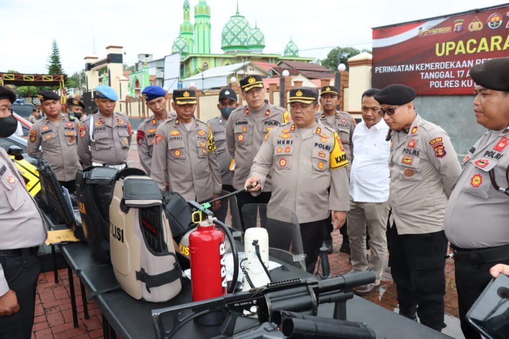 Dengan didampingi oleh seluruh pejabat utama Polres Kubar, Kapolres Kubar Heri Rusyaman, S.I.K., M.H melakukan pemeriksaan satu per satu seluruh kendaraan Dinas R-2, R-4 dan R-6 yang meliputi kebersihan, lampu depan, lampu belakang, plat nomor, ban, sirine dan rotator serta kelengkapan kendaraan lainnya.