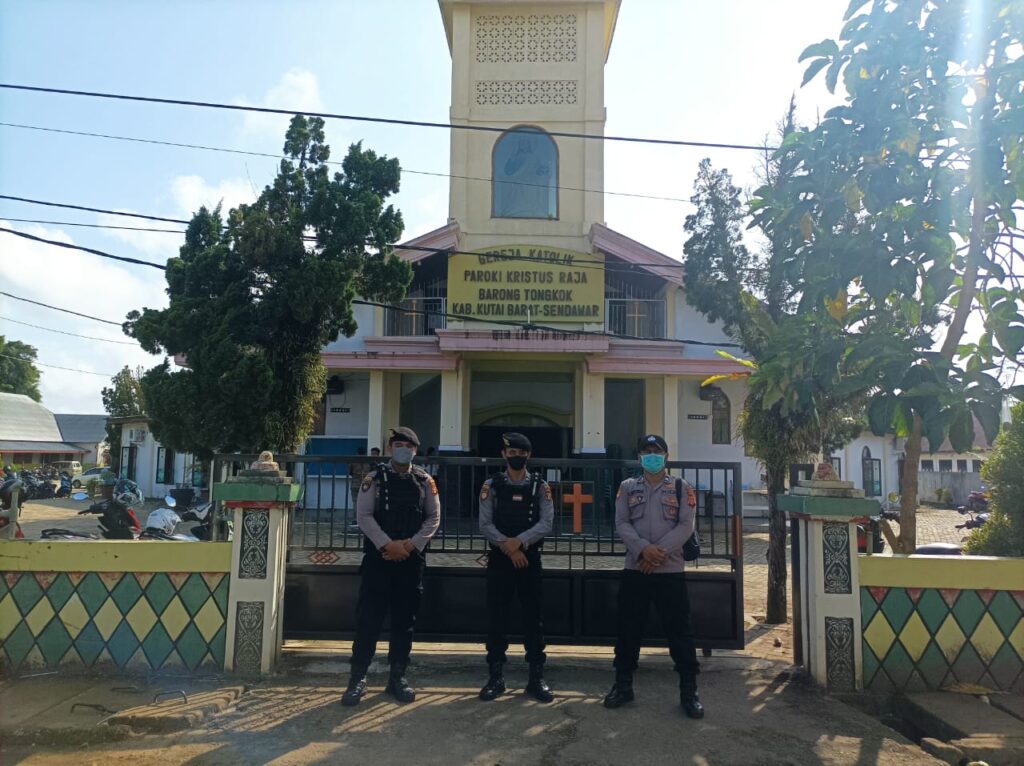 Polres Kutai Barat — Anggota Polres Kutai Kutai Barat dan jajaran Polsek melaksanakan kegiatan pengamanan gereja-gereja di wilayah Kabupaten Kutai Barat Minggu (18/9/2022) pagi.