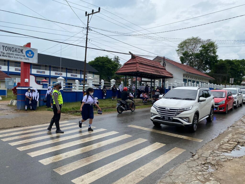 ATUR LALU LINTAS PAGI, SATLANTAS POLRES KUTAI BARAT BANTU ANAK SEKOLAH MENYEBRANG JALAN.