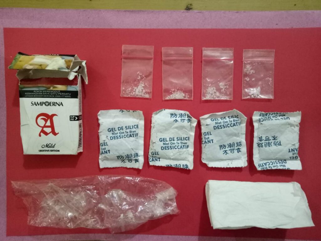 Dari tangan pengedar narkotika ini, lanjut AKP Bitab Riyani, S.H., petugasnya berhasil menyita barang bukti a. 4 (empat) Poket narkotika jenis shabu-shabu yang di bungkus plastik putih bening dengan berat kotor 1,1 Gr, 4 bungkus silica gel warna putih, 1 buah bekas bungkus rokok sampoerna warna putih, 1 lembar potongan tissu warna putih, 1 lembar potongan plastik warna bening yang dilapisi dengan isolasi bening.