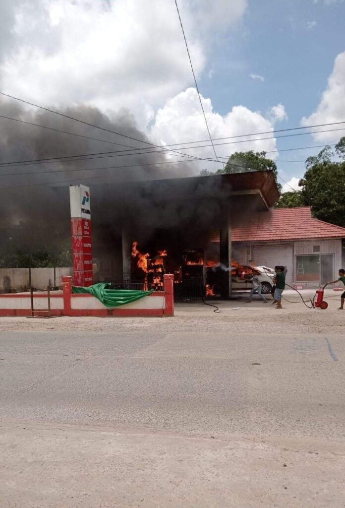 Kebakaran menghanguskan 1 Unit kendaraan Toyota Innova, 2 Unit kendaraan Suzuki Pickup, dan 1 Unit motor Suzuki dan 1 unit SPBU di Muara Lawa, Kec. Muara Lawa, Kab. Kubar, Senin (26/09/2022) Siang.