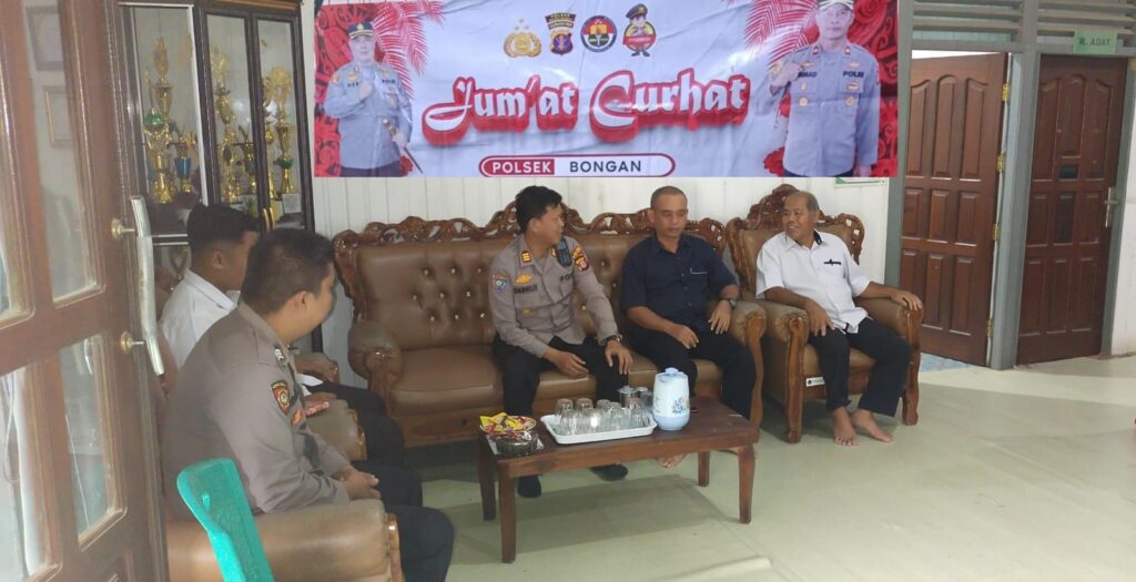 Polsek Bongan – Kapolsek Bongan Polres Kutai Barat AKP Darnuji, S.H., mendengarkan aspirasi masyarakat melalui program ‘Jumat Curhat’ di Kantor Kepala Kampung Penawai yang ada di Kampung Penawai Kecamatan Bongan Kab. Kutai Barat, Jumat (29/12/2023)