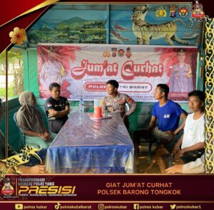 Kegiatan yang dimulai sekitar pukul 10.00 Wita tersebut dipimpin langsung oleh Kapolsek Barong Tongkok AKP Sunarto, S.H., bersama personel Polsek Barong Tongkok. Jumat Curhat merupakan salah satu program Polri untuk mendengarkan secara langsung aspirasi, keluhan, serta permasalahan masyarakat terkait situasi keamanan dan ketertiban masyarakat (kamtibmas).